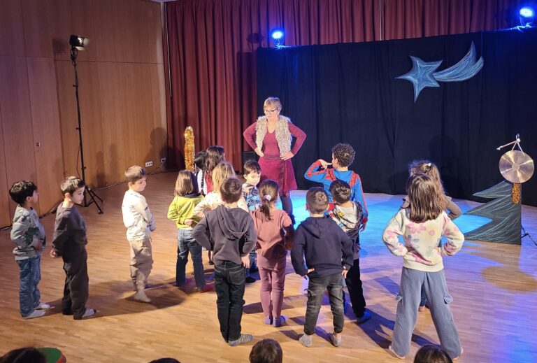 Alma Jongerius begeisterte mit ihrem Mitmachtheater die Kinder der beiden Kindergärten Weissenstein. Zuerst haben sich alle Zuschauer warm angezogen, bevor die ersten Kinder es auf der Bühne schneien liessen, Schneemänner bauten und Schneeballschlachten vollführten. Doch dann verwandelten sich die Kinder in Schafe, versteckten sich vor dem gefährlichen Bären, bevor sie den pantomimisch dargestellten Sack des Hirten mit fantasievollen Geschenken für das neugeborene Kind füllten. Mit dem Hirten machten sie sich danach auf zum Stall, wo sie das Kind fanden, umringt mit Engeln, Waisen, Ochs und Esel. Noch im Kindergarten versprühten die Kinder ihre grosse Begeisterung, weil sie heute nicht nur Zuschauer gewesen waren, sondern im Theater richtig mitgespielt hatten!