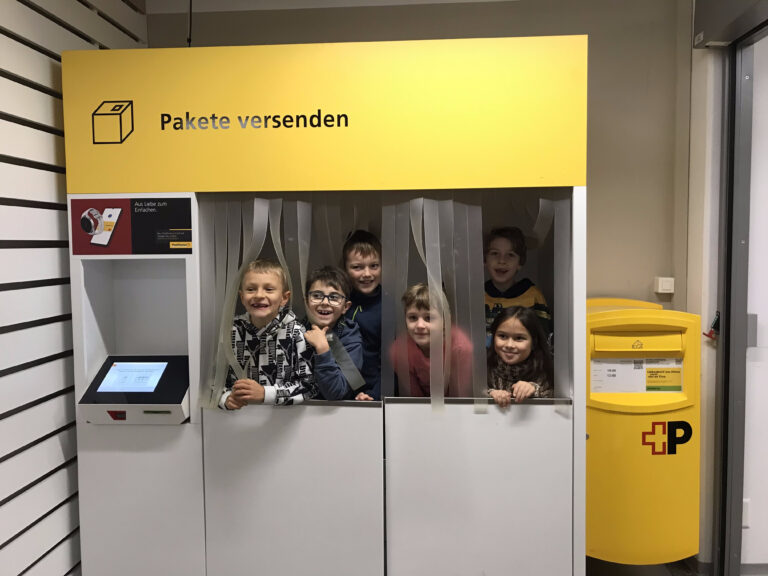Die zweite Gruppe wurde von Frau Hanni Hänggi durch die Postfiliale geführt: Die gelben Briefkästen wurden geleert, ebenso die Paketkiste. Da musste man auch noch die Adresscodes einscannen und die Quittungen ausdrucken. Dann ging’s weiter auf dem Weg der Pakete und Briefe. Nach A- und B-Post getrennt werden sie in Wagen gelegt, damit sie am Abend vom Transportdienst abgeholt werden können. Schliesslich durfte jedes Kind seine eigens gestaltete Postkarte frankieren, stempeln und versandfertig machen – Ob wohl alle am Bestimmungsort ankommen?